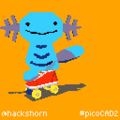 I made a 'sequel' to an older model I made of skating wooper on picoCAD, but now with more detail and animations on picoCAD 2! Had fun experimenting with the new animation editor!